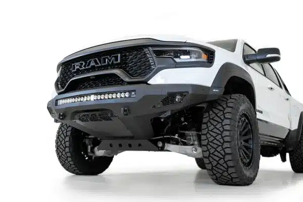 Upgrade your Ram TRX with the Stealth Fighter Front Bumper. This low-profile, plate steel design includes light mounts, a full skid plate, and retains OEM features. Built tough, made in America, and ready for anything!